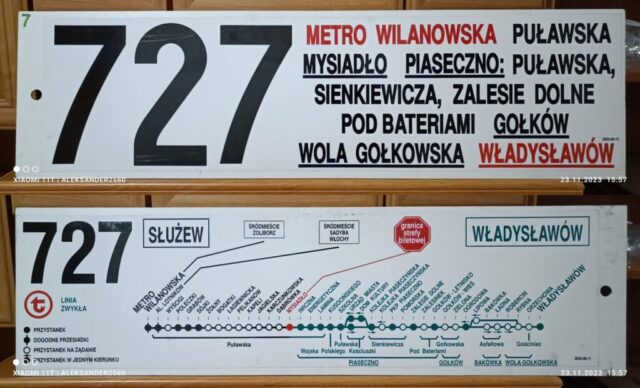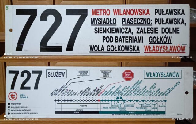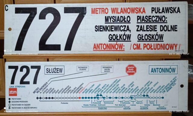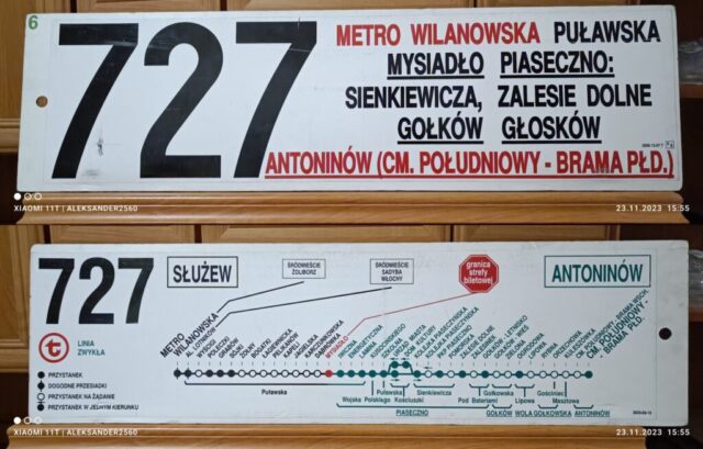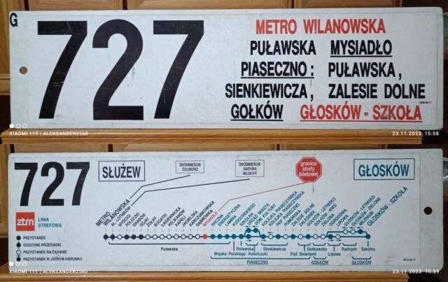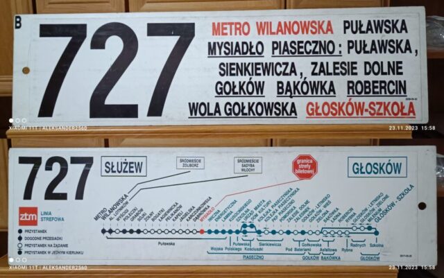 Również 1 września 1995 roku ZTM uruchomił linię „727” na trasie Metro Wilanowska – Głosków. Numer ten także miał wcześniejsze wcielenie – w latach 1992–1995 kursował między Piasecznem a Głoskowem jako linia eksterytorialna (bez przystanków w Warszawie).