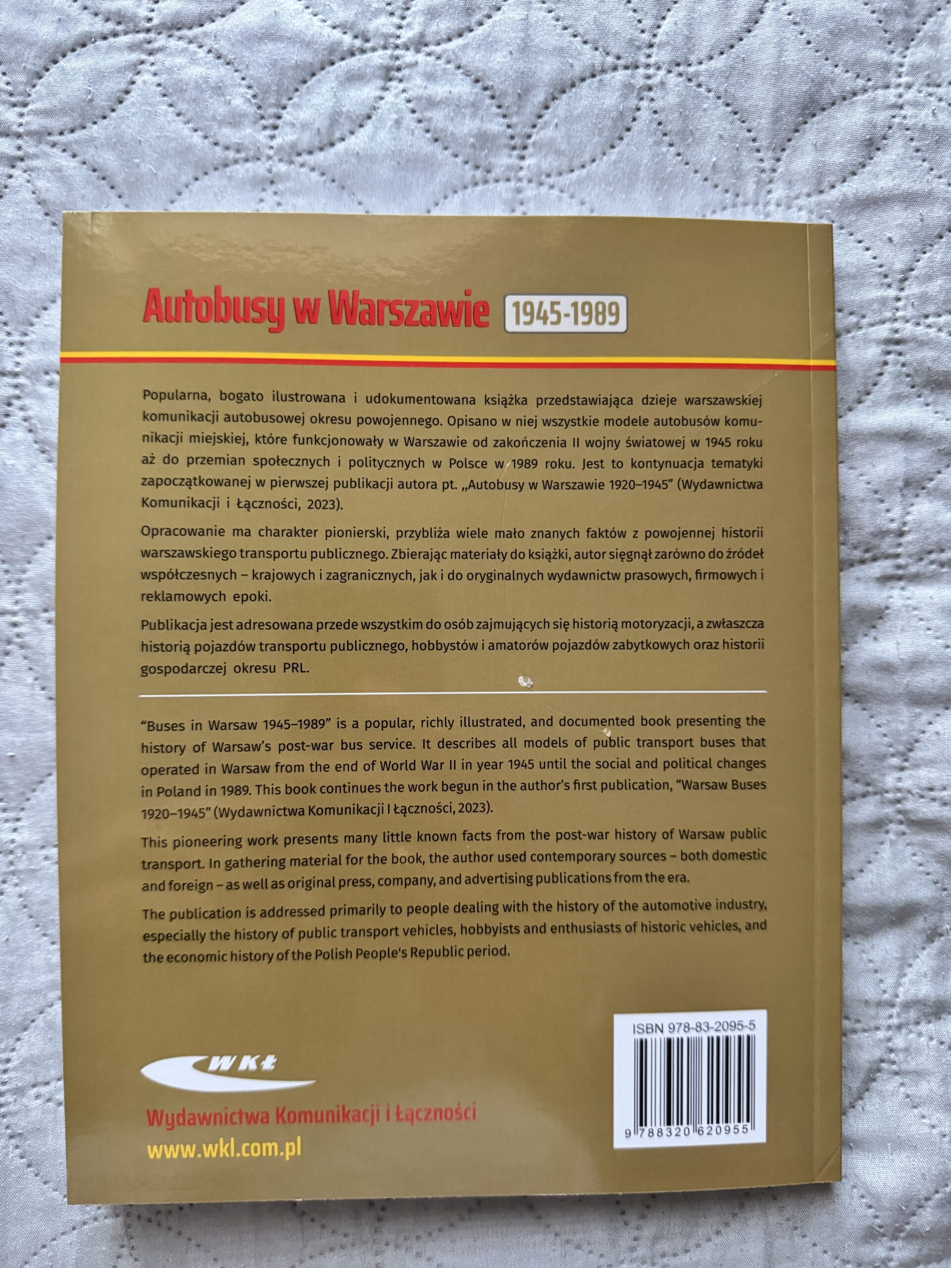 W marcu br., nakładem Wydawnictw Komunikacji i Łączności ukazała się kolejna książka autorstwa Romualda Cieślaka pt. ,,Autobusy w Warszawie 1945-1989”, przedstawiająca historię warszawskiej komunikacji autobusowej powojennego okresu PRL. Opisano w niej wszystkie marki i modele autobusów komunikacji miejskiej, które funkcjonowały w Warszawie od zakończenia II wojny światowej w 1945 roku, aż do wystąpienia przemian społecznych i politycznych w Polsce w 1989 roku. Jest to kontynuacja tematyki związanej z warszawskim transportem publicznym, zawartej w pierwszej publikacji autora pt. ,,Autobusy w Warszawie 1920-1945” (WKiŁ 2023).