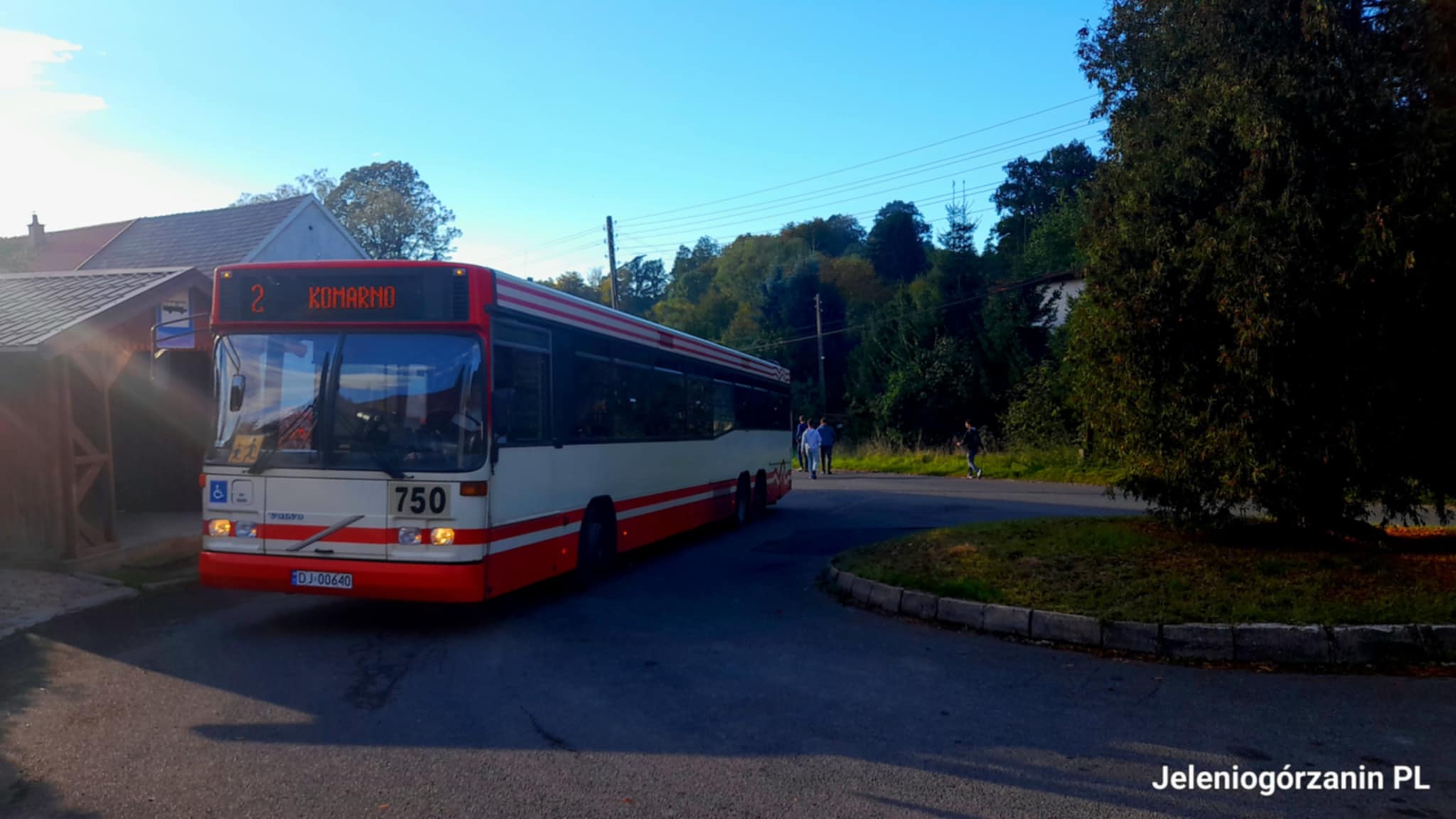 Pierwszy raz jeleniogórska komunikacja miejska zawitała do Komarna na przełomie lat 1969 i 1970. Wtedy to została tutaj – niektórymi kursami – wyciągnięta jeżdżąca dotychczas do Chłopskiej „dwójka”. I od tamtej pory jedynie ta linia tutaj jeździ. Do 31 maja 2016 odjeżdżała stąd do pętli przy Karola Miarki, od 1 czerwca tegoż roku została wydłużona na Osiedle Orle. Stąd też o ile wcześniej królowały tu autobusy solo, to od połowy 2016 roku pojazdy trzyosiowe i przegubowe nie są tu już rzadkością.