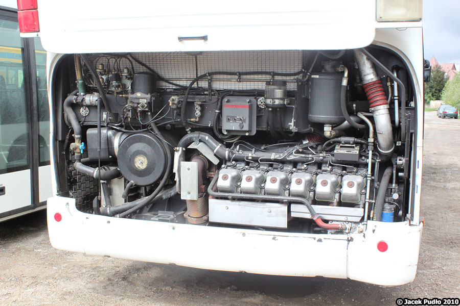 Scania OmniCity została zaprojektowana z myślą o maksymalnej funkcjonalności w ruchu miejskim. Silnik wysokoprężny montowany był poprzecznie w tylnej części pojazdu, co umożliwiało zastosowanie pełnej niskiej podłogi na niemal całej długości autobusu. Takie rozwiązanie wymagało jednak zastosowania przekładni kątowej, która przenosiła napęd z poprzecznie umieszczonego silnika na oś napędową. W prezentowanym przypadku jednostka napędowa współpracowała z automatyczną skrzynią biegów firmy ZF, znaną ze swojej solidności, choć z czasem wykazującą brak płynności zmiany biegów, czyli szarpanie.