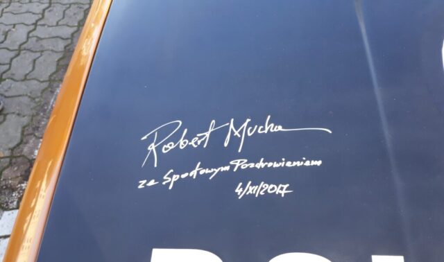 PM: Od problemów i smutków nie da się uciec nawet “rajdowym” Fiatem. Dla mnie moje hobby to sposób na wolny czas. Zobacz ile możliwości daje taki samochód. Możesz sobie coś naprawić lub ulepszyć w samochodzie, możesz pojechać na wycieczkę czy zlot, możesz spotkać ludzi o podobnych zainteresowaniach. Kiedyś wymyśliłem sobie, że kupię do Fiata drugą maskę silnika, pomaluję ją na czarno i będę się starał aby podpisywali się na niej ludzie, którzy kojarzą nam się z FSO i Fiatami 125p. Nie jest to proste, bo mówimy już o mocno starszych osobach. Ale już trochę autografów mam. A każdy podpis to spotkanie z ciekawym i supersympatycznym człowiekiem. Każdy miał coś ciekawego do powiedzenia. Kogo dzięki mojej pasji miałem przyjemność spotkać? Np. wieloletniego dyrektora FSO – Edwarda Pietrzaka. Rajdowych mistrzów – Roberta Muchę, Tomasza Ciecierzyńskiego, Macieja Stawowiaka. Na masce podpisał się również Andrzej Dąbrowski – większość kojarzy go jako piosenkarza ( “Mery En”, “Zielono mi”, “Do zakochania jeden krok”), ale pan Andrzej jest również fotografem, perkusistą jazzowym oraz kierowcą rajdowym. Był nawet wicemistrzem Polski i należał do FSO TEAM w czasach kiedy Fiat dominował na polskich trasach rajdowych. Jak więc widzisz, z Fiatem nie można się nudzić.
