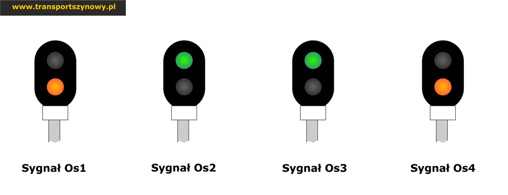 | Os4 | Semafor, do którego odnosi się tarcza, wskazuje sygnał zezwalający na jazdę z prędkością nie przekraczającą 40 km/h (S10-S13) lub 60 km/h (S10a-S13a) |